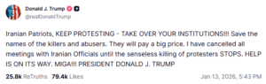 Serokê Amerîkayê Donald Trump piştî bang li welatiyên Îranê kir ku “berxwedana xwe dewam bikin, dest dayînin ser saziyên dewletê” û pê re jî got “alîkarî di rê de ye“, vêca jî ji welatiyên Amerîkayê yên li Îranê daxwaz kir ku bi rêya bejayê birevin Tirkiyê yan jî Ermenistanê.